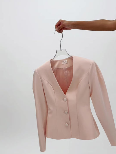 Fresh, feminine, and tailored with a modern twist, the Savannah Blazer is a standout piece for spring dressing. Designed in soft tulip pink crepe, this single-breasted blazer features a crisp V-neckline for a clean, contemporary look. Oversized sleeves add fashion-forward drama, while the peplum hem beautifully accentuates the hips for a flattering, sculpted silhouette. Finished with a front button closure, double back vents for ease of movement, and a smooth satin lining, the Savannah Blazer feels as polished as it looks. Paired with the matching Savina taffeta bubble shorts, this set is perfect for spring brunches, daytime events, and chic city outings where playful tailoring meets confident style.