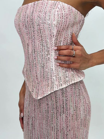 Featuring sculpted princess seams and a softly dipped waistline, the Tosca Dress is designed to flatter with refined elegance and subtle drama. Crafted in a light pink–to–white gradient beaded fabric, this sleeveless sheath-style gown skims the figure beautifully for a sleek, elongated silhouette. A built-in corset provides structure and support, keeping everything perfectly in place throughout the night. Finished with an invisible back zipper for a smooth, seamless fit, this dress is effortlessly polished from every angle. Gracefully stunning and undeniably eye-catching, the Tosca Dress is made to turn heads at prom night, formal evenings, and unforgettable celebrations where sparkle and sophistication go hand in hand.
